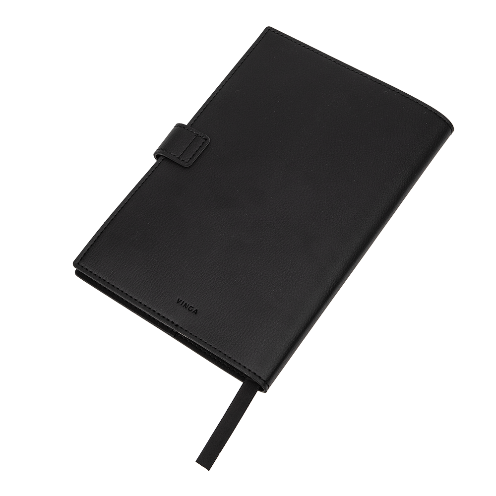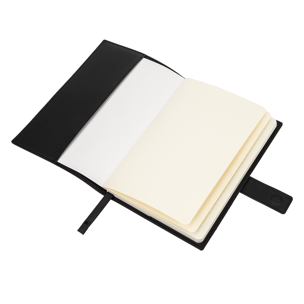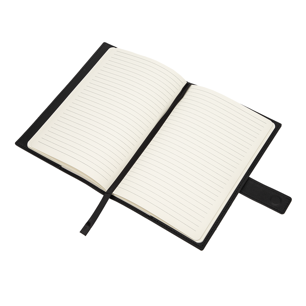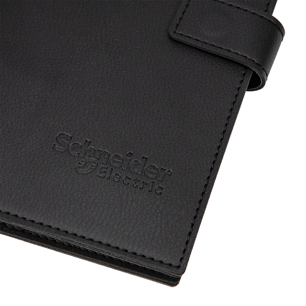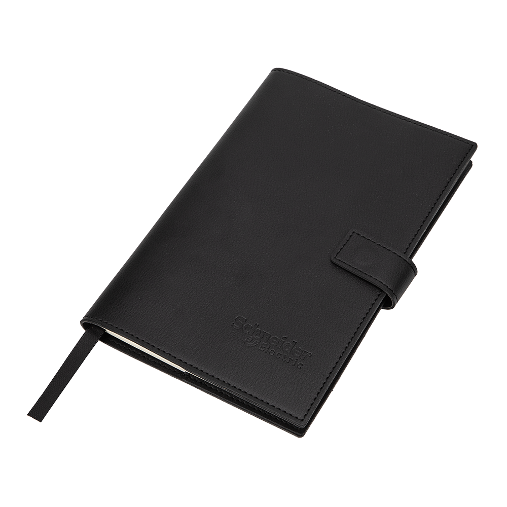 This sophisticated notebook has been produced using recycled materials. Features include a magnetic closure tab and a ribbon page marker. Branded with the Schneider Electric wordmark debossed to the corner of the cover.