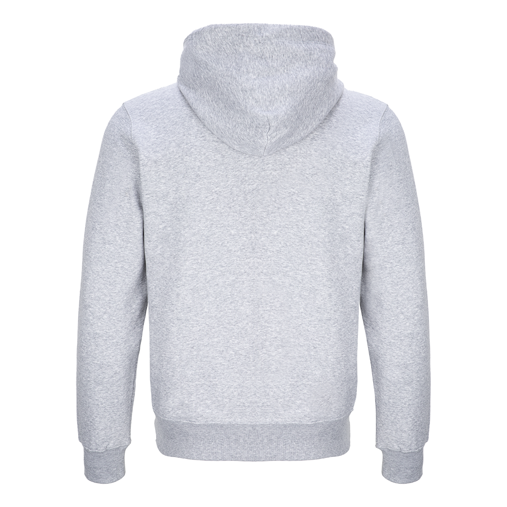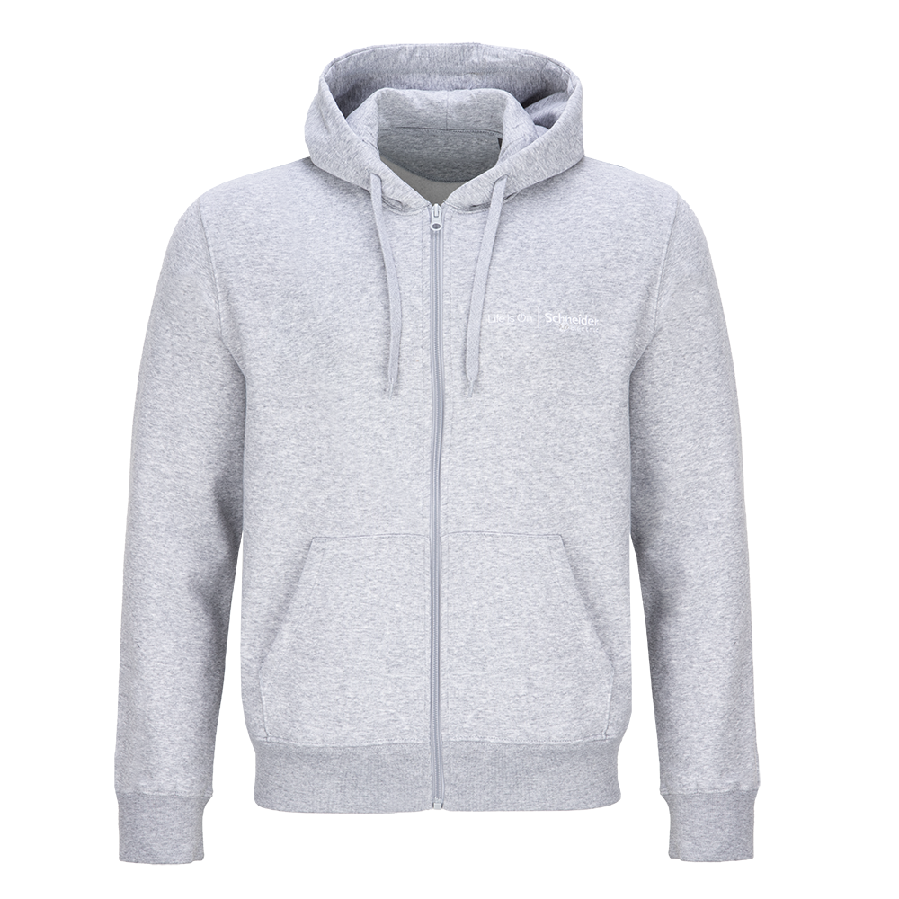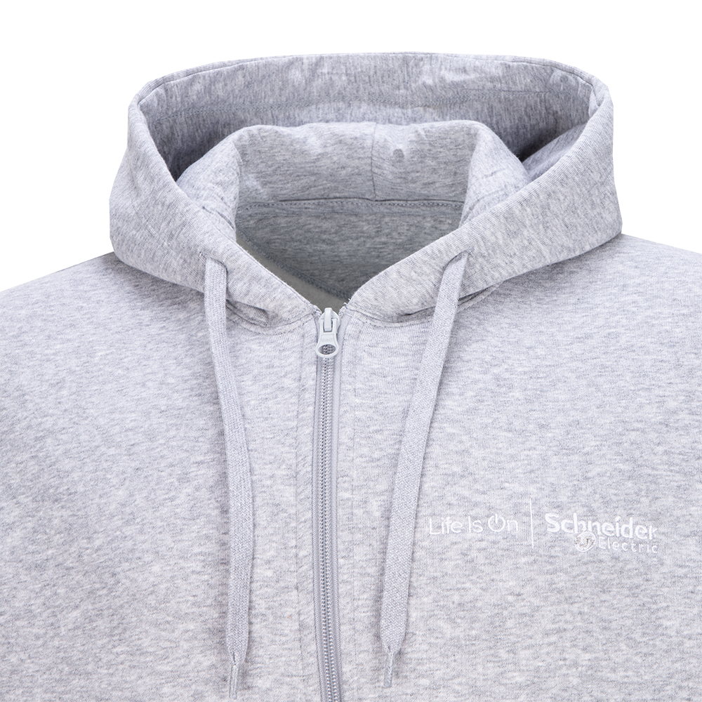 A classic and comfortable grey full-zip hoodie, with drawcords to the hood and the Life Is On | Schneider Electric wordmark embroidered to the left chest.