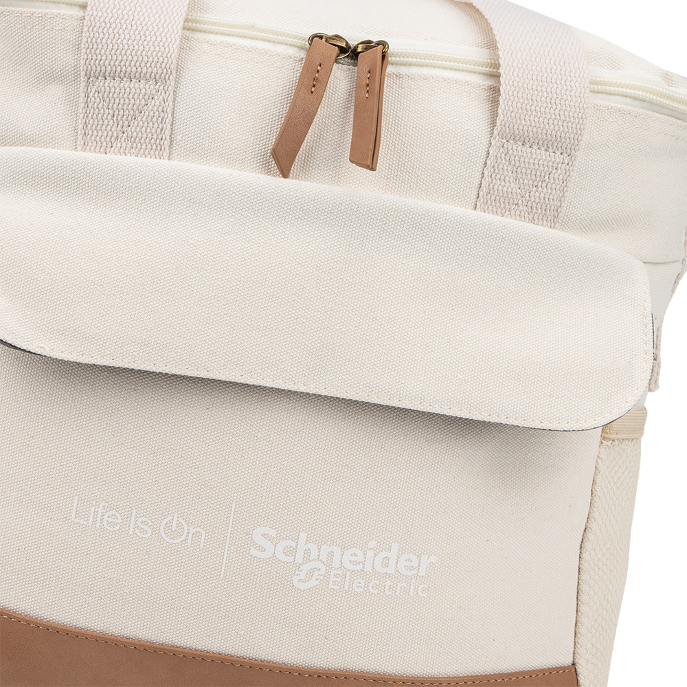 Perfect for picnics, this cooler bag can store snacks, meals, or up to 20 cans. With 2 mesh side pockets and 1 front pocket for extra storage. Branded with the Life Is On | Schneider Electric wordmark.