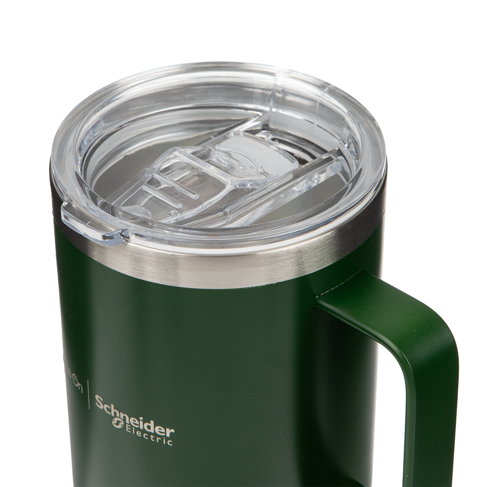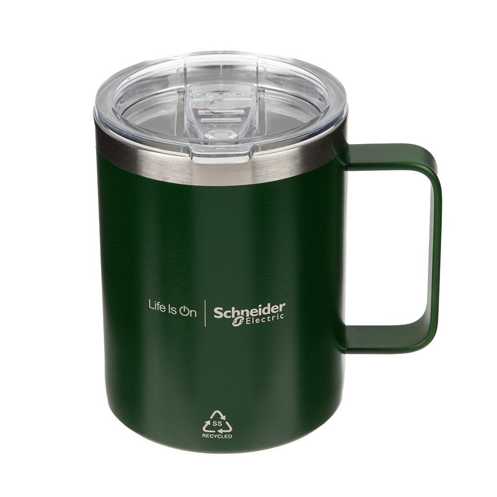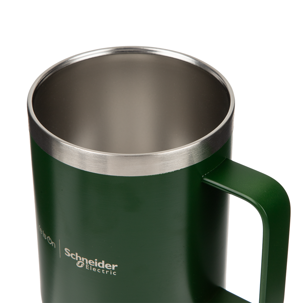 This grab-and-go stainless steel mug has a handle for easy drinking, perfect for your morning brew. Branded with the Life Is On | Schneider Electric wordmark to the side.
